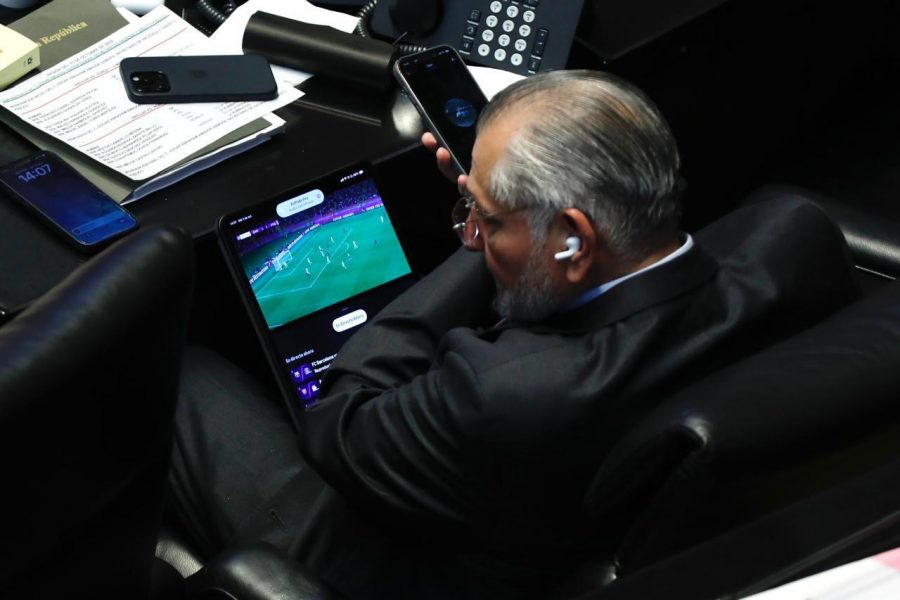 Se difundió una imagen donde se observa al legislador con atención en la transmisión del encuentro deportivo, mientras en tribuna se desarrollaba la intervención del funcionario federal, quien detallaba la situación de las finanzas públicas del país.