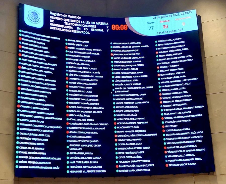 México, 28 de junio.- El pleno del Senado aprobó este sábado con 77 votos en pro y 30 en contra el dictamen de la nueva Ley en Materia de Telecomunicaciones y Radiodifusión, una iniciativa presentada por la presidenta Claudia Sheinbaum que plantea una reestructura profunda del marco regulatorio del sector.
