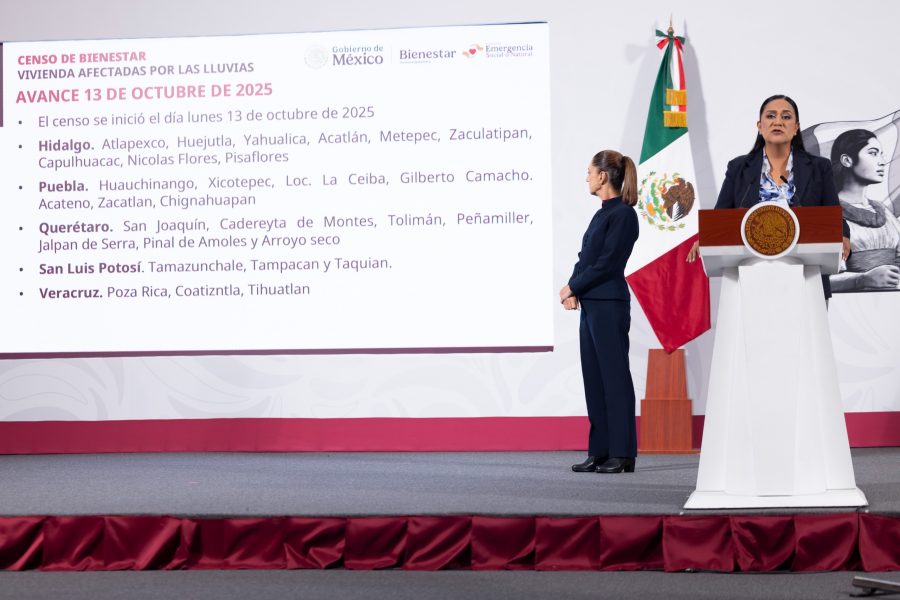 México, 14 de octubre.- La secretaria del Bienestar, Ariadna Montiel Reyes, informó que personal de la dependencia inició el censo de viviendas afectadas por las lluvias en comunidades de Veracruz y otras entidades, con prioridad en las zonas más dañadas.