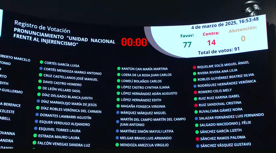 En un pronunciamiento redactado solo por Morena y los partidos Verde y del Trabajo, y aprobado con 77 votos en pro y 14 en contra, el oficialismo expresó su respaldo firme al llamado de unidad nacional realizado por la presidenta Claudia Sheinbaum.