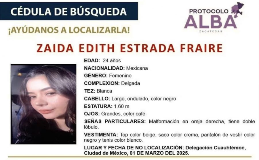 Zacatecas, 3 de marzo.- La Fiscalía General de Justicia de Zacatecas, confirmó que la madrugada de este lunes se recibió una denuncia por la no localización de la joven Zaida Edith Estrada Fraire, de 24 años, quien desapareció en la Ciudad de México el pasado sábado, después de participar en un foro juvenil en el Senado de la República.