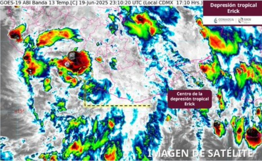 México, 19 de junio.- La Comisión Nacional del Agua (Conagua) y el Servicio Meteorológico Nacional (SMN) informaron que el fenómeno meteorológico “Erick” se degradó a depresión tropical, pero se mantiene en tierra sobre el estado de Guerrero.