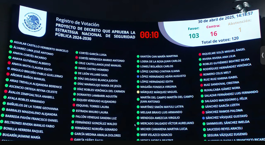México, 30 de abril.- Con el respaldo de Morena y sus aliados, y pese a la oposición del PRI y la división interna del PAN, el Senado aprobó con 105 votos en pro, 16 en contra y 1 abstención la nueva Estrategia Nacional de Seguridad presentada por la presidenta Claudia Sheinbaum.