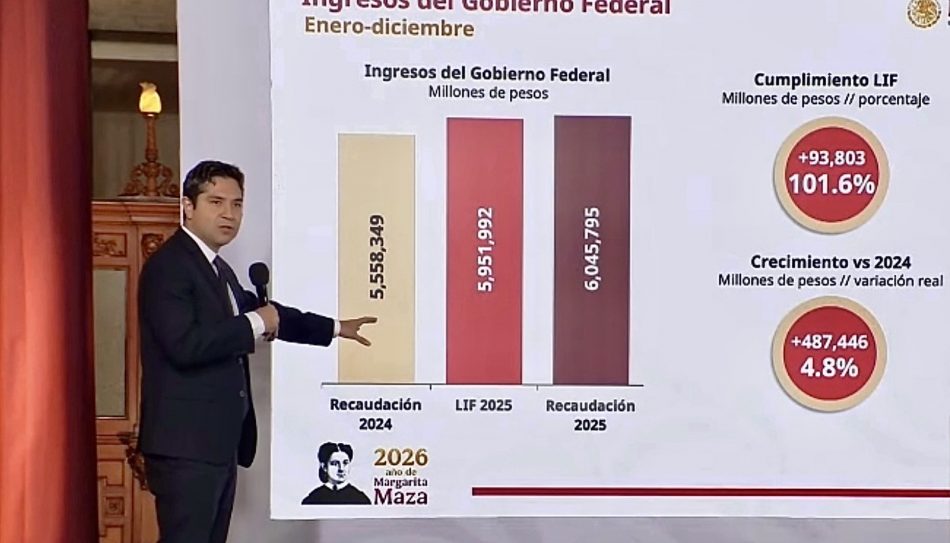 Durante su presentación, el titular del SAT destacó que el monto recaudado fue 93 mil 803 millones de pesos mayor a lo previsto para el ejercicio fiscal 2025, cuyo objetivo era de 5.9 billones de pesos, lo que refleja —dijo— un cumplimiento del 101.6% de la meta establecida por el Congreso.