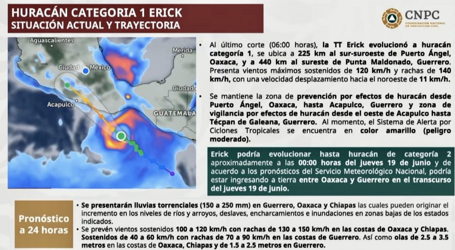 “Erick podría evolucionar hasta huracán de categoría 2, aproximadamente en los primeros minutos del día de mañana, jueves 19 de junio, y de acuerdo a los pronósticos del Servicio Meteorológico Nacional podría estar ingresando a la tierra entre Oaxaca y Guerrero en el transcurso del día de mañana”, informó la titular de la CNPC.