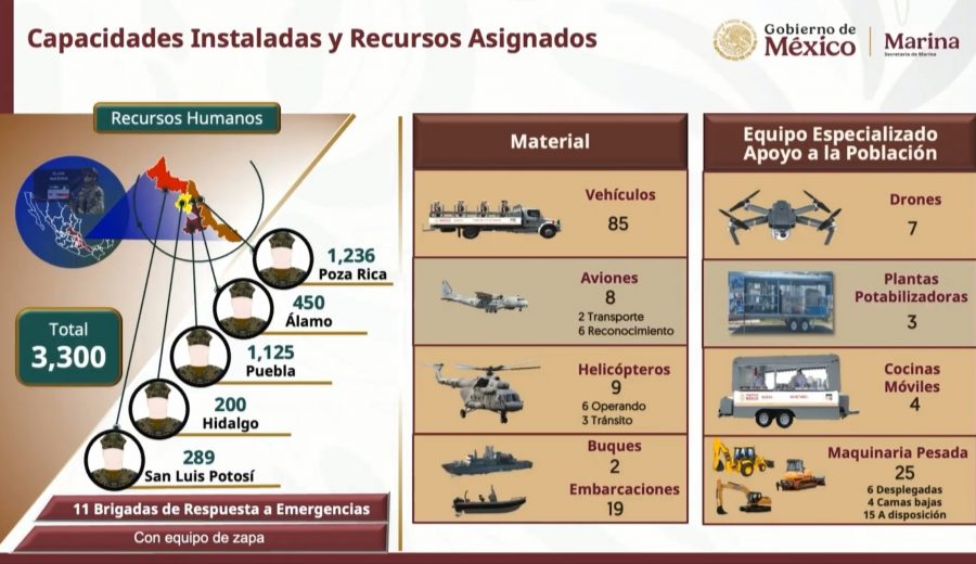 Mientras tanto, en Hidalgo, los efectivos de la Marina operan en el municipio de Metztitlán, con 200 elementos, 10 vehículos, cuatro embarcaciones, un avión, un helicóptero, una cocina móvil y un vehículo con despensas.
