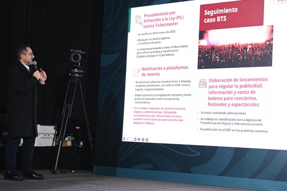 México, 2 de febrero.- La Procuraduría Federal del Consumidor (PROFECO) inició un procedimiento por infracción a la ley en contra de Ticketmaster México, derivado de irregularidades detectadas en la venta de boletos para los conciertos de la banda surcoreana BTS, informó su titular, Iván Escalante.