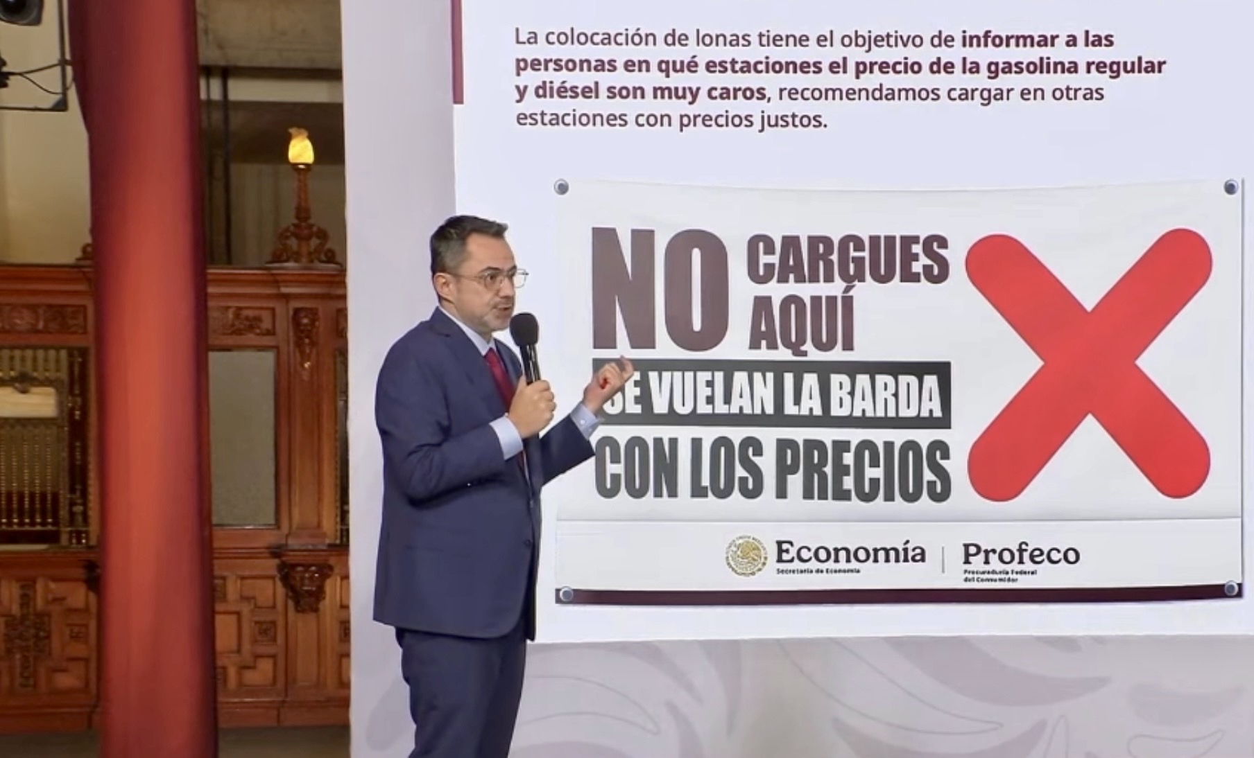 Durante el informe semanal “Quién es Quién en los Precios”, el titular de Profeco, Iván Escalante, anunció que a partir de esta semana se retomará la colocación de lonas con la advertencia “no cargues aquí”, dirigidas a señalar a las gasolineras que “se vuelan la barda” con los precios.