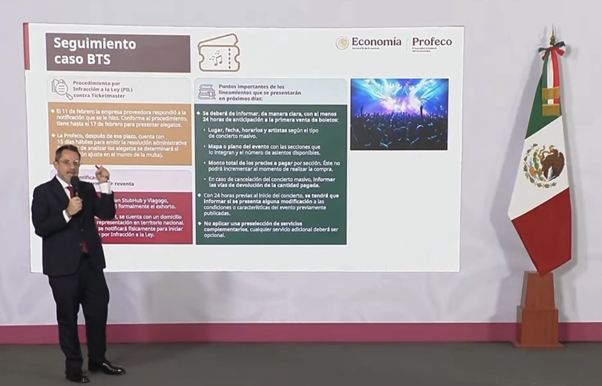 México, 16 de febrero.- El titular de la Procuraduría Federal del Consumidor (Profeco), Iván Escalante, presentó una actualización relevante sobre el procedimiento abierto a empresas vinculadas con la venta y reventa de boletos para conciertos, a raíz del caso BTS, al tiempo que anunció la publicación de nuevos lineamientos obligatorios que regularán este mercado en México.