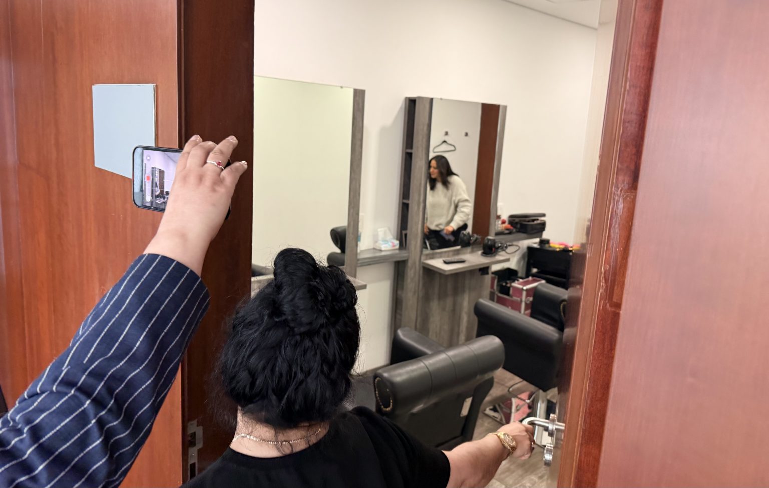Al interior, el lugar está acondicionado como una estética convencional: dos sillas negras frente a espejos, un lavabo para lavado de cabello, un carrito con herramientas de estilizado y una caja rosa de aproximadamente un metro de altura que resguarda brochas y productos de maquillaje. A un costado, dos sillas adicionales permiten la espera de quienes acuden al servicio.