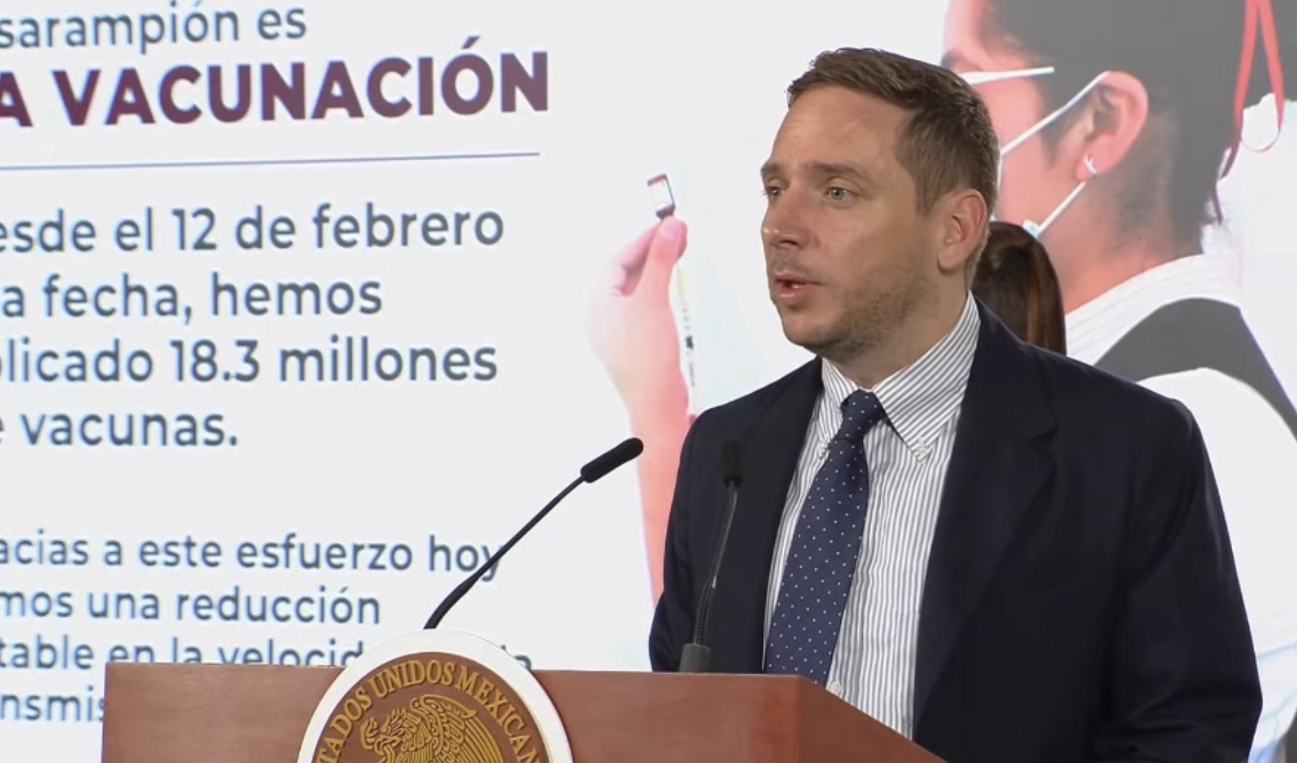 México, 7 de abril.- El subsecretario de Integración Sectorial y Coordinación de Servicios de Atención Médica, Eduardo Clark, informó que la campaña nacional de vacunación contra el sarampión ha logrado una reducción de casi 66% en los casos diarios, al pasar de alrededor de 220 contagios por día a menos de 70 en las últimas semanas.