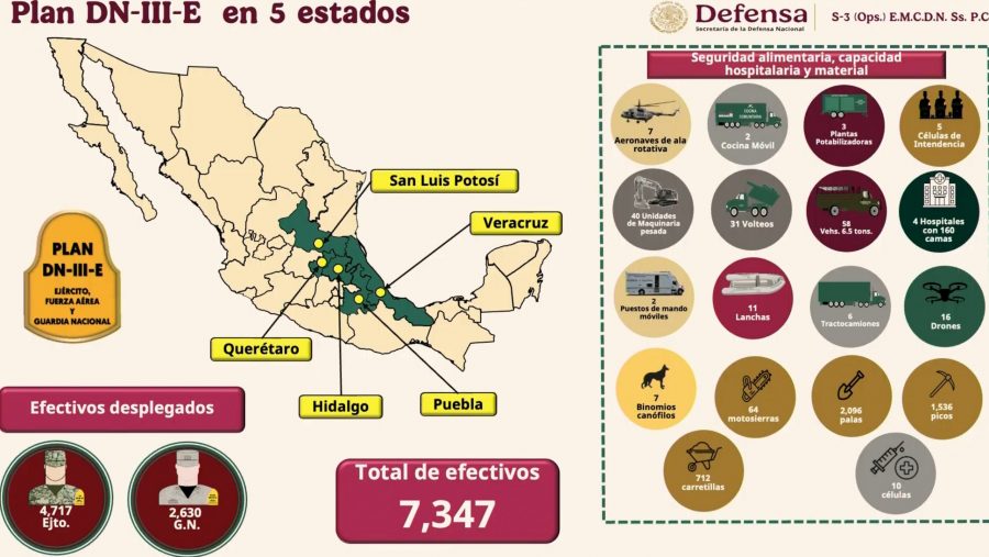 “Desde la madrugada del jueves 9 de octubre se aplicó el Plan DN-III-C con personal del Ejército, la Fuerza Aérea, la Guardia Nacional, conforme al procedimiento ya establecido de manera inmediata con las unidades orgánicas, es decir, las que se encuentran desplegadas en estas cinco entidades, San Luis Potosí, Veracruz, Querétaro, Hidalgo y Puebla.