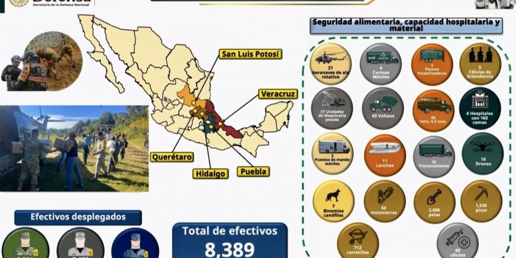 México, 17 de octubre.- El secretario de la Defensa Nacional, general Ricardo Trevilla, informó que el Ejército y la Fuerza Aérea mantienen desplegados 8 mil 389 efectivos en la aplicación del Plan DN-III-E, con operaciones simultáneas de auxilio y recuperación en los estados de Veracruz, Puebla, Hidalgo, Querétaro y San Luis Potosí, tras las severas lluvias de los últimos días.