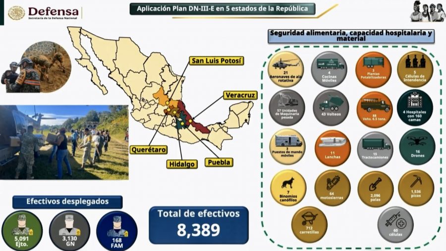 México, 17 de octubre.- El secretario de la Defensa Nacional, general Ricardo Trevilla, informó que el Ejército y la Fuerza Aérea mantienen desplegados 8 mil 389 efectivos en la aplicación del Plan DN-III-E, con operaciones simultáneas de auxilio y recuperación en los estados de Veracruz, Puebla, Hidalgo, Querétaro y San Luis Potosí, tras las severas lluvias de los últimos días.