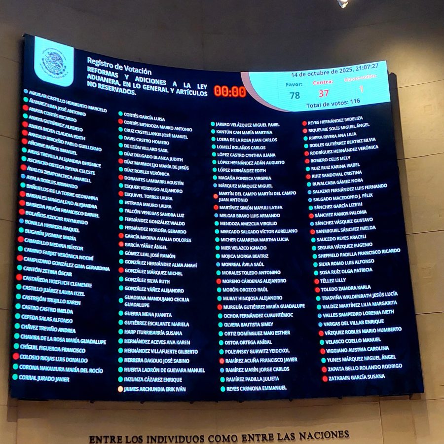 México, 14 de octubre.- Esta noche, el Senado de la República aprobó con 78 votos en pro, 37 en contra y una abstención la Ley Aduanera con una modificación en su artículo primero transitorio, que establece que la norma entrará en vigor a partir del 1 de enero de 2026.