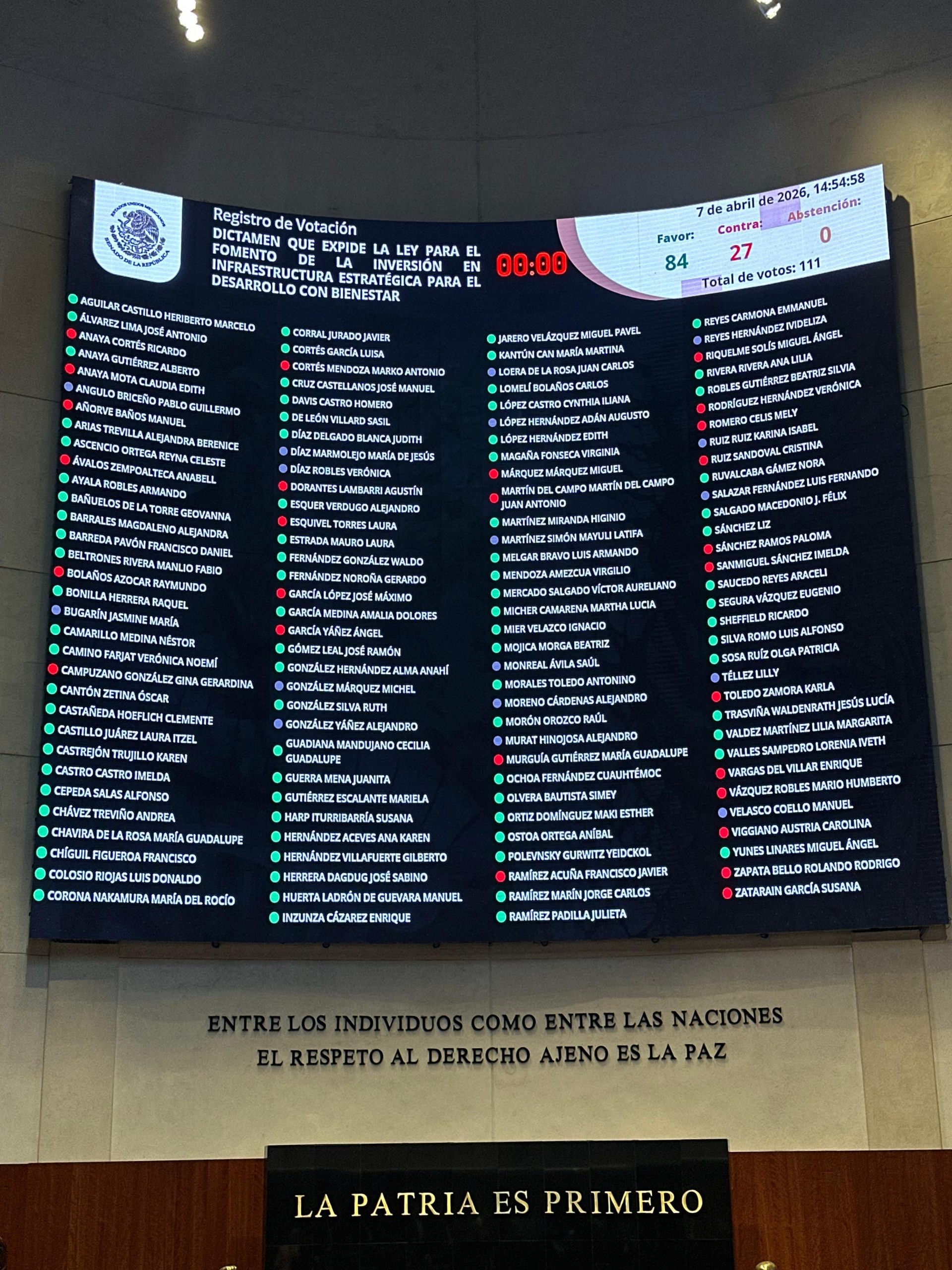 México, 7 de abril.- Con 84 votos a favor y 28 en contra, el Senado de la República aprobó la expedición de la nueva Ley para el Fomento de la Inversión en Infraestructura Estratégica para el Desarrollo con Bienestar, así como reformas a la Ley Federal de Presupuesto y Responsabilidad Hacendaria, con el objetivo de impulsar proyectos prioritarios mediante esquemas de inversión pública y privada.