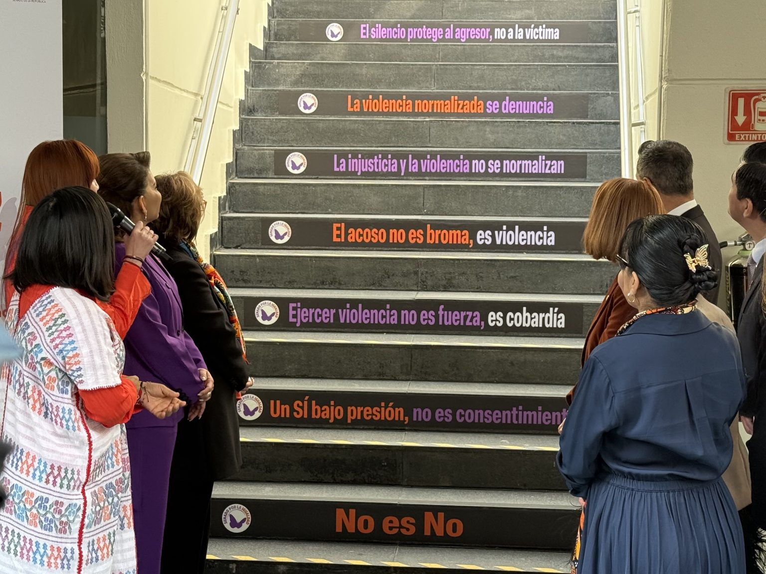 Las escalinatas inauguradas exhiben mensajes directos contra la violencia y a favor del consentimiento, como: