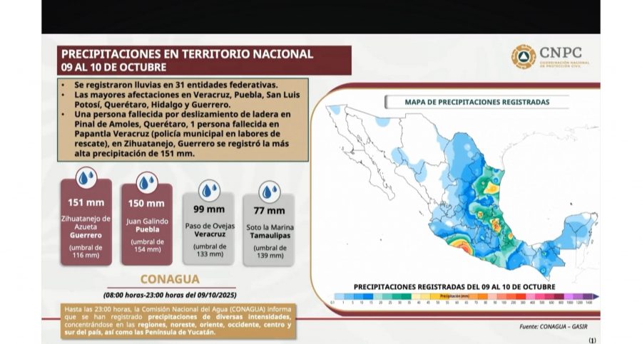 “El día de ayer en 31 entidades federativas tuvimos lluvias de diferentes intensidades, solamente en Baja Sur, en Baja California Sur no tuvimos lluvias. Las mayores afectaciones, presidenta, han sido en Veracruz, Puebla, San Luis Potosí, Querétaro, Hidalgo y Guerrero. En Guerrero, en Zihuatanejo es donde se registró la más alta precipitación, que fue de 151 milímetros”, reportó.