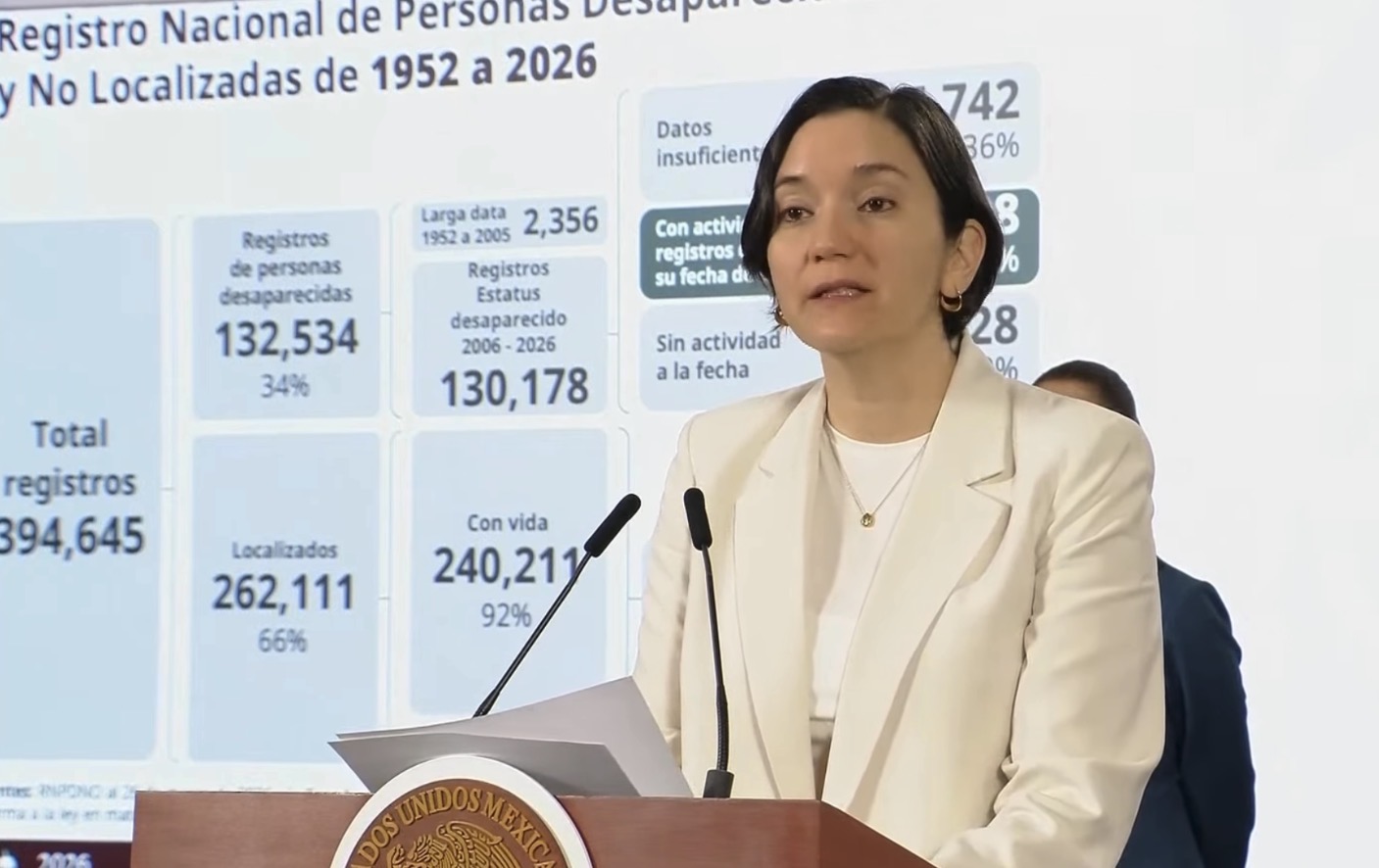 Durante la presentación del informe, Marcela Figueroa, titular del Secretariado Ejecutivo del Sistema Nacional de Seguridad Pública, informó que desde 1952 a la fecha se han registrado 394 mil 645 personas desaparecidas, de las cuales 66% (262 mil 111) han sido localizadas, y 92% de ellas con vida.