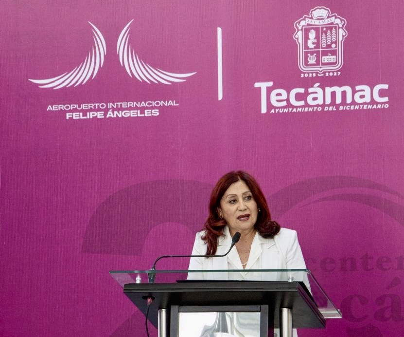 Durante el evento, realizado en las instalaciones del Aeropuerto Internacional Felipe Ángeles (AIFA), la presidenta municipal destacó que la ubicación geoestratégica de Tecámac —conectado directamente al AIFA— lo convierte en un punto privilegiado para la inversión, el desarrollo económico y el turismo.