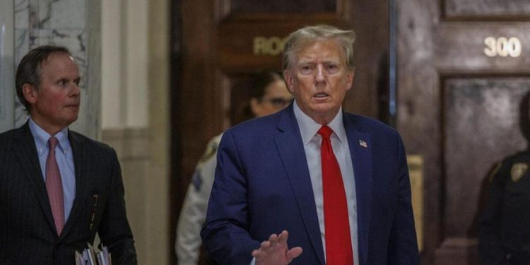 Trump no se dirigió a la corte. Sin embargo, se conferió en voz baja con sus abogados varias veces durante la audiencia.